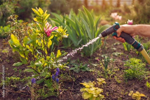 Gardener watering plants with hose pipe in spring garden. Taking care of magnolia tree and blooming flowers.