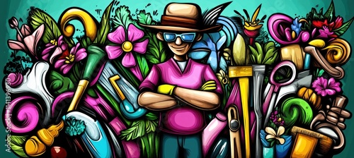 gardener, tool, plant, flower, equipment, garden, gardening, vector, illustration, nature, work, hobby, cartoon, happy, summer, spring, bloom, agriculture, foliage, green, growth, flora, design, colourful, art, graphic, artwork, vibrant, decoration, cheerful, smiling, confident, hat, glove, brush, rake, shovel, pot, shear, watering, hose, dirtied, seed, cultivation, drawing, stylised, whimsical