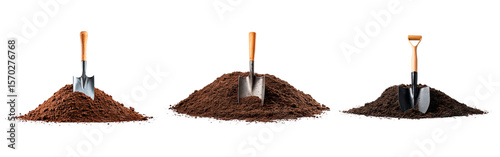 Gardening and agriculture concept with three shovels in soil on transparent background, PNG