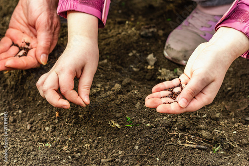 Gardening conceptual background. Children's and woman's hands planting sorrel seeds in to the soil