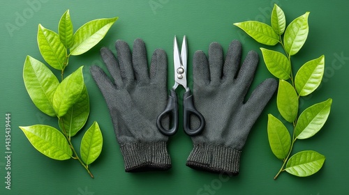 gardening, glove, scissors, pruners, shear, green, leaf, spring, summer, nature, plant, growth, care, tool, equipment, protection, hand, work, hobby, activity, healthy, vibrant, fresh, organic, eco, sustainable, earth, environment, landscaping, horticulture, agriculture, botany, floral, greenery, blossom, foliage, twig, branch, detail, closeup, overhead, background, texture, design, illustration
