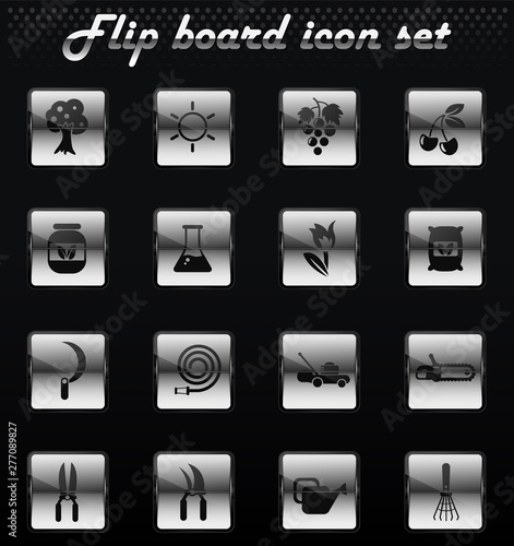 icon, vector, symbol, gardening, grape, cherry, tree, sun, tulip, flower, bag, bank, flask, chain saw, sickle, hose, watering can, rake, scissors, pruning shears, flip, mechanical, display