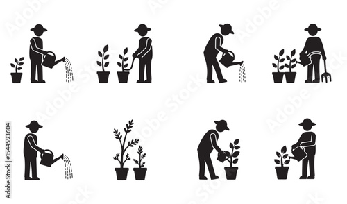Gardening icons featuring silhouetted farmers watering plants in pots with watering cans