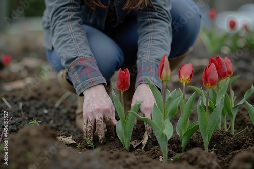 Gardening scene showing person caring for blooming red tulips in rich soil. Concept of spring flower care, maintenance and seasonal garden work.