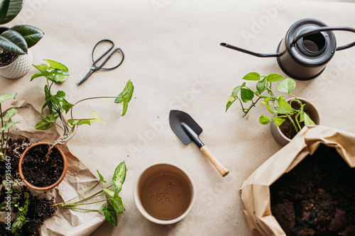 Gardening tools, different sort of houseplants, white flower pots, black watering can on rumpled craft paper