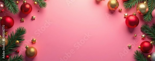 Garlands of colorful Christmas ornaments on a pink background, red, pink background, decorations