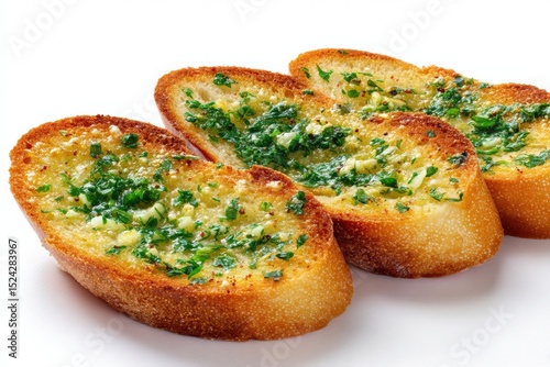 Garlic bread slices topped with fresh herbs served on a white background for appetizing culinary presentation