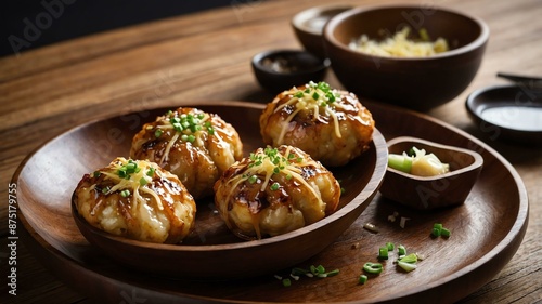 garlic butter takoyaki with garlicinfused butter addin served aesthetically in a wooden plate and table