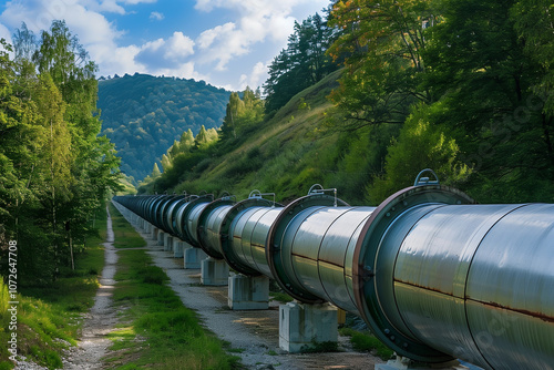 Gas transportation pipelines in the field, Long black steel pipeline stretching through green forest landscape, nature and industry concept