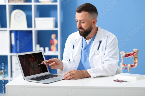 Gastroenterologist showing screen with illustration of digestive tract at table in clinic