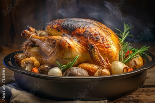 Gastronomic delight Whole roasted turkey or chicken with flavorful vegetables
