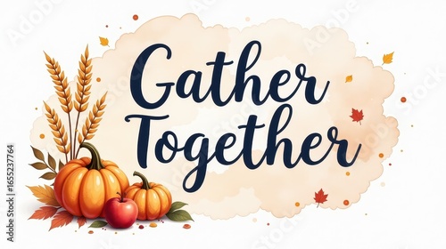 "Gather Together" lettering with watercolor illustration in soft pastel colors decorated with autumn elements pumpkins, wheat, apples, falling leaves, cozy rustic vibe