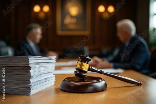 Gavel and Documents: Legal Matters. A gavel rests on a table next to a stack of files, with blurred figures in suits in the background, hinting at legal proceedings.