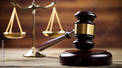 Gavel and Scales of Justice on Wooden Table