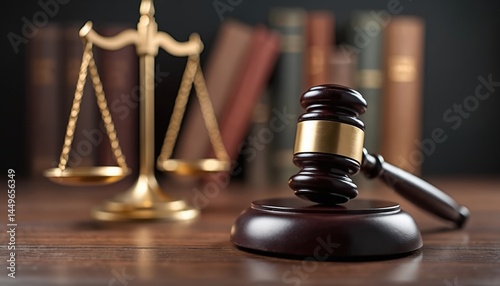 Gavel scales justice law books on wooden table. Concept of law, legal system, courtroom, judgment, legislation. Symbol of fairness, ethics, rights, regulations. Court decision, lawyer, advocate,