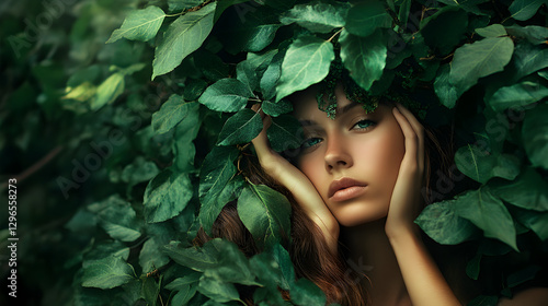 gazing into a mirror, her reflection showing her as a being made entirely of vines and blossoms