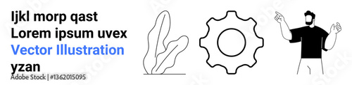 Gear shape, leafy plant, and expressive person with sample text suggest innovation, growth, and collaboration. Ideal for business, teamwork, creativity, innovation education marketing simple