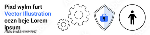 Gear symbols, shield with lock, human figure icon symbolize technology, security, privacy, user access. Ideal for cybersecurity, data protection, innovation privacy policy IT services system