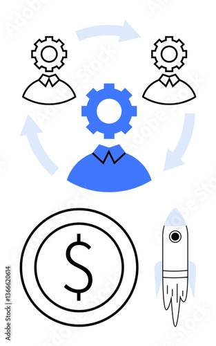 Gear-connected team members, circular workflow arrows, dollar coin, and rocket representing teamwork, process optimization, financial growth, innovation. Ideal for business, management startup