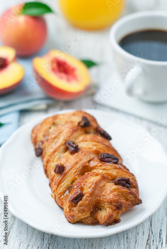 pastry, bistro, puff pastry, sandwich, food, mealtime, breakfast, cookie, snack, coffee, juice, peach