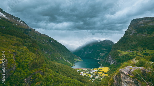 Geirangerfjord, Norway. Geiranger In Geirangerfjorden In Sunny Summer Day. Famous Norwegian Landmark And Popular Destination. 4K