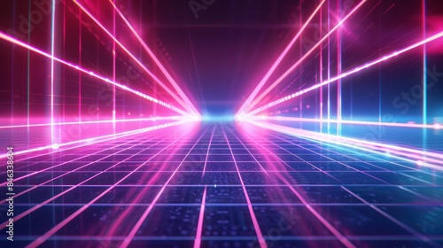 Generate a dynamic photo of neon-like blue and pink light beams casting a futuristic glow on a vintage grid floor backdrop.