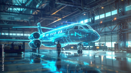 Generate an illustration of machine learning systems predicting maintenance needs for aircraft, featuring holographic diagnostics in a high-tech hangar