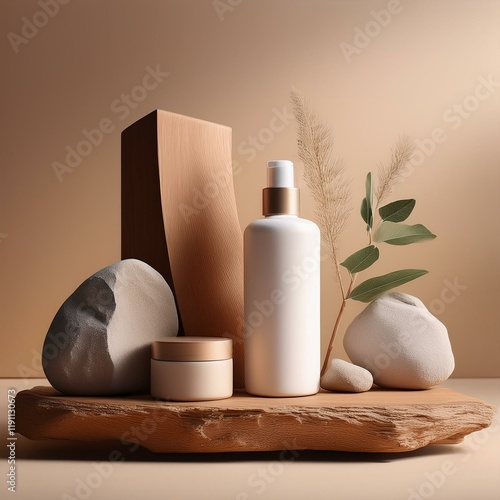 Generated image product photography skincare products on a clean light beige background with some stones