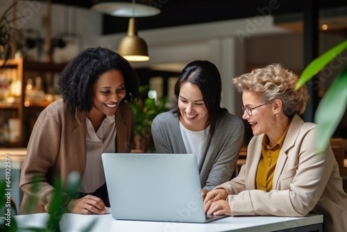 Generative AI : Joy of teamwork. Female coworkers using laptop,
