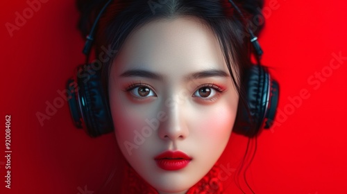 ヘッドフォンを付けた美しい女性の顔クローズアップ,Generative AI AI画像