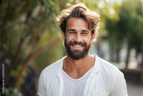 Generative ai collage portrait of happy positive guy relax in green garden look in camera