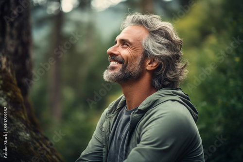 Generative AI illustration happy yoga person enjoying medication in natural wild conditions beautiful view