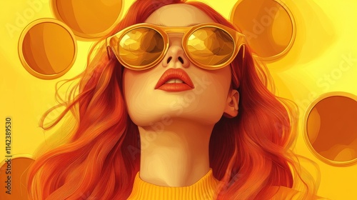 Generative AI illustration of A beautiful pensive young woman in yellow clothes with red hair wearing a set of futuristic sunglasses on yellow background