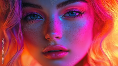 Generative AI illustration of human face of female fashion model with colored wavy hair and bright makeup looking at camera