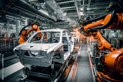Generative AI illustration of Robots welding on car assembly line