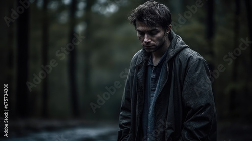 Generative ai illustration of sad man standing under rain