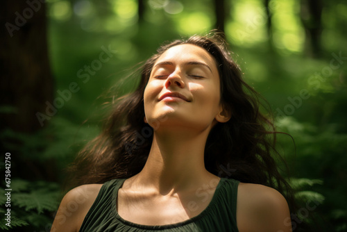 Generative AI portrait of overjoyed young woman spend day green forest feel good