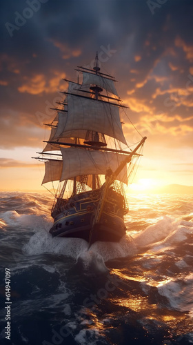 sunset, ocean, sea, ship, boat, travel, sailboat, three-dimensional, water, sky, illustration, nautical, wave, sunrise, sail, cloud, vessel, transportation, dusk, old, romantic, yacht, history, sun, cruise, antique, battle, wind, ancient, wooden, voyage, silhouette, adventure, historic, transport, maritime, retro, historical, military, navigation, vintage, exploration, classic, pirate, traditional, ray, tall