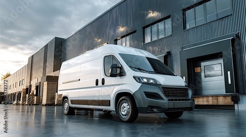 Generic white delivery van parked outside a modern warehouse building with loading docks, representing logistics, distribution, and transportation