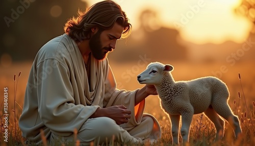 shepherd, lamb, sunrise, meadow, nature, compassion, care, calmness, innocence, faith, connection, warmth, pastoral, wildlife, solitude, human, animal, agriculture, rural, serenity, harmony, peace, love, nurturing, spirituality, landscape, peaceful, soft light, countryside, grazing, beauty, natural, joy, bonding, grass, horizon, golden hour, tenderness, kneeling, religious, figure