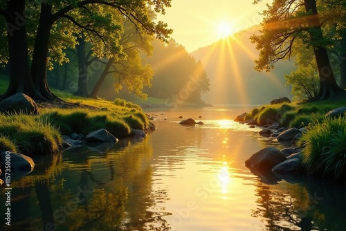 Gentle stream flowing into a tranquil lake with golden sunbeams, golden, calm