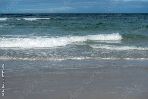 Gentle waves roll and break softly onto a sandy beach, capturing the calming rhythm of the ocean—ideal for themes of tranquility, nature, coastal beauty, and seaside relaxation.