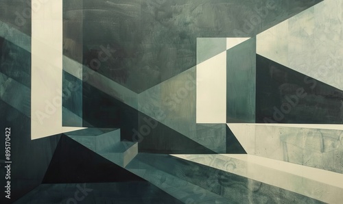 Geometric abstraction with precise lines and geometric shapes, exploring the interplay of light and shadow in a minimalist oil artwork