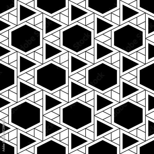 Geometric background. Hexagons, triangles, rhombuses pattern. Embroidery backdrop. Triangular, quadrangular, hexagonal shapes wallpaper. Ethnic motif. Digital paper. Abstract image. Seamless ornament