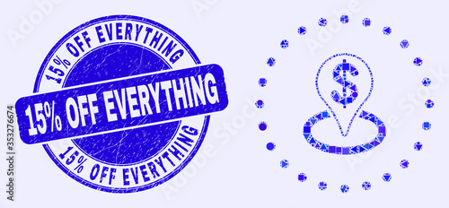 Geometric bank placement mosaic pictogram and 15% Off Everything watermark. Blue vector rounded grunge watermark with 15% Off Everything phrase.