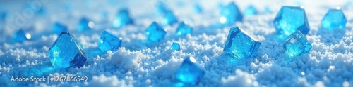Geometric blue ice crystals scattered on a frosty surface creating a mesmerizing visual effect, frozen, icy