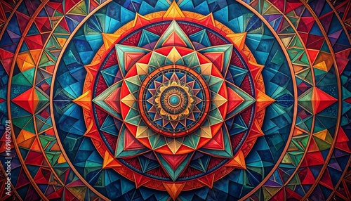 Geometric fractal mandala with repeating polygonal shapes in vivid colors