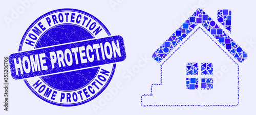 Geometric home mosaic icon and Home Protection seal. Blue vector rounded distress seal with Home Protection title. Abstract mosaic of home combined of circle, triangles, square geometric items.