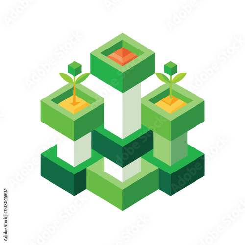 growth, plant, germinating, germ bud, isometric, geometric, cube, green, sustainability, environment, ecology, nature, abstract, illustration, vector, modern, design, building, structure, concept, graphic, minimalist, environmentally friendly, garden, architecture, spring, vibrant, colourful, upward, development