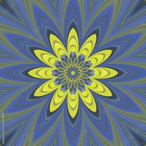 geometric kaleidoscopic hexagonal patterned design in shades of blue and yellow on a black background